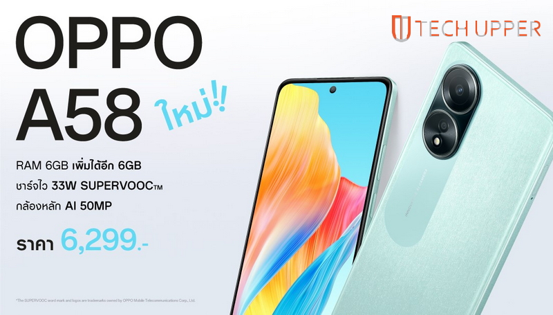 ออปโป้ ไทยแลนด์ แบรนด์เทคโนโลยีชั้นนำระดับโลก วางจำหน่าย “OPPO A58” สมาร์ตโฟนรุ่นใหม่ล่าสุดจาก OPPO A Series อย่างเป็นทางการในประเทศไทย พร้อมให้คุณใช้งานได้เต็มพิกัด ทุกความบันเทิง ตอบโจทย์ทุกเอ็นเตอร์เทน ไม่ว่าจะดูหนัง ฟังเพลงหรือเล่นเกมก็ใช้งานได้อย่างลื่นไหลด้วย RAM 6GB เพิ่มหน่วยความจำได้อีก 6GB ใช้งานได้แบบไม่มีสะดุดด้วยชาร์จไว 33W SUPERVOOC ใช้งานได้ทั้งวันด้วยการชาร์จเพียง 75 นาที และแบตเตอรี่ใหญ่ 5,000mAh
