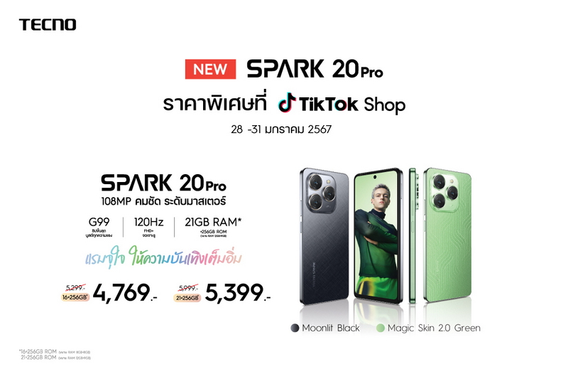 SPARK 20 Series สมาร์ตโฟนรุ่นใหม่ Entertainment Master แห่งยุค จาก Tecno Mobile เปิดตัวอย่างเป็นทางการแล้วผ่านช่องทาง TikTok Shop – Tecno Mobile TH ในวันที่ 28 มกราคม 2567 พร้อมราคาสุดพิเศษที่ทุกคนสามารถเป็นเจ้าของได้แบบสบายกระเป๋า โดยมีการวางจำหน่ายพร้อมกันถึง 3 รุ่นได้แก่