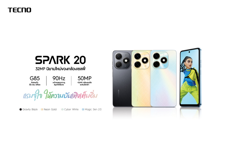 ประเดิมกันด้วยตัวท็อปอย่าง SPARK 20 Pro ที่ถือเป็นสมาร์ตโฟนรุ่นแรกของไทยในช่วงราคา 5,000 บาท ที่ให้ RAM มาสูงถึง 21GB เหมาะสำหรับคนใช้งานมือถือหนักๆ รองรับทั้งการเล่นเกม ดูหนัง ฟังเพลง และทำงาน ด้วยชิปเซ็ตทรงพลังระดับท็อปสุดของ MediaTek G99 เร็วแรงสุดขั้ว และอัตรารีเฟรชเรท 120Hz เต็มตากับภาพและเสียงที่สมจริงบนหน้าจอขนาดใหญ่ 6.8” พร้อมกล้องหลัง 108MP และกล้องหน้า 32MP มี 2 สเปกให้เลือก คือ