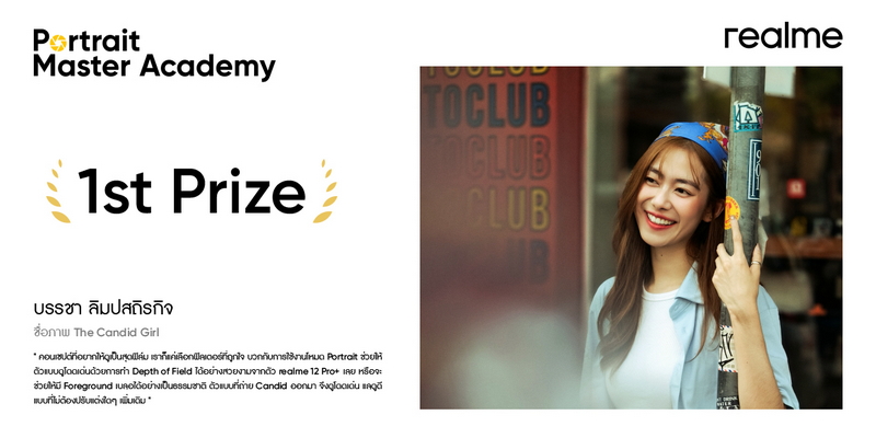เสร็จสิ้นไปแล้วด้วยความสำเร็จเกินความคาดหมาย! กับโครงการประกวดภาพถ่ายครั้งยิ่งใหญ่แห่งปี “2024 realme Portrait Master Academy” เวทีสำหรับผู้รักการถ่ายภาพบุคคลด้วยสมาร์ตโฟนที่มอบโอกาสการแสดงออกถึงความคิดสร้างสรรค์และการเรียนรู้เทคนิคขั้นสูงจากช่างภาพมืออาชีพ โดยจัดกิจกรรมเวิร์กช็อปรอบสุดท้ายและประกาศตำแหน่ง Portrait Masters ไปเมื่อวันที่ 11 พฤษภาคมที่ผ่านมา ซึ่งผู้ชนะเลิศได้แก่ ผลงาน “The Candid Girl” โดย บรรชา ลิมปสถิรกิจ ฝ่าย realme Thailand เตรียมนำผลงานชนะเลิศขึ้นป้ายโฆษณาสถานีรถไฟฟ้า MRT เพื่อให้สาธารณชนได้ร่วมชมผลงานภาพถ่ายที่สวยงามและสัมผัสถึงประสิทธิภาพของฟีเจอร์กล้องในสมาร์ตโฟน realme ซึ่งตอบโจทย์การถ่ายภาพแนวไลฟ์สไตล์ได้อย่างครอบคลุม กิจกรรมครั้งนี้ประสบความสำเร็จเกินคาดและ realme Thailand กำลังวางแผนจัดกิจกรรมส่งเสริมศักยภาพของคนรุ่นใหม่อย่างต่อเนื่องในเร็ว ๆ นี้
