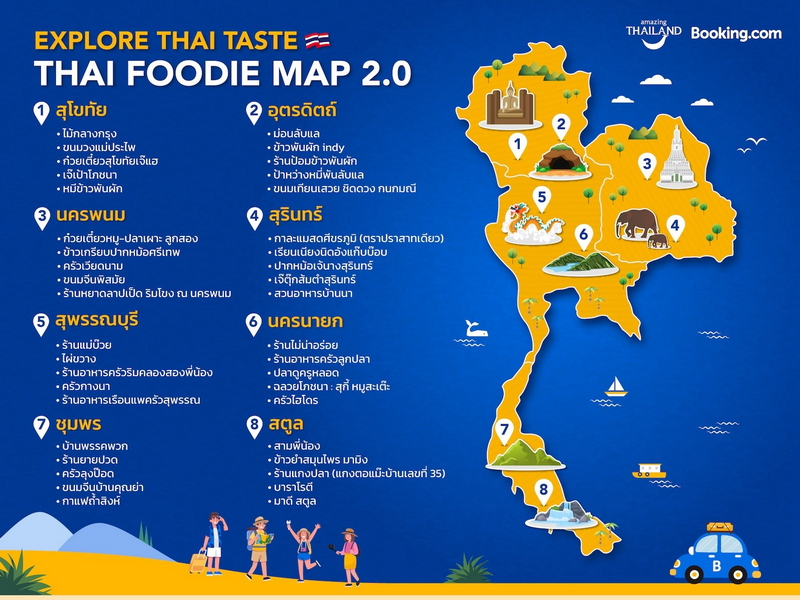 เมื่อเจาะลึกไปยังแบบสำรวจความคิดเห็นของผู้เดินทางเพื่อคาดการณ์เทรนด์การเดินทางท่องเที่ยวปี 2567 ของ Booking.com* พบว่า 78% ของผู้เดินทางชาวไทยสนใจเรียนรู้ต้นกำเนิดอาหารถิ่นที่ “ห้ามพลาด” ในจุดหมายปลายทางที่ตั้งใจจะเดินทางไปเยือน มากกว่าที่เคยเป็นมา และเพื่อตอบสนองเทรนด์ของ “ผู้เดินทางสายกิน” ที่ต้องการลิ้มรสอาหารถิ่นซึ่งรักษารสชาติต้นตำรับไว้ ‘Thai Foodie Map 2.0’ จึงได้เปิดตัวเส้นทางและจุดหมายปลายทางแห่งใหม่ที่จะทำให้เหล่านักชิมทุกคนได้เดินทางตามรอยอาหารถิ่นในภาคต่าง ๆ ของประเทศไทยจำนวน 40 ร้านใน 8 จังหวัดทั่วไทย ได้แก่ สุโขทัย อุตรดิตถ์ นครพนม สุรินทร์ นครนายก สุพรรณบุรี ชุมพร และสตูลได้อย่างง่ายดายยิ่งขึ้น ไม่เพียงเท่านั้น ‘Thai Foodie Map 2.0’ หรือคู่มือเดินทางและแผนที่อาหารถิ่นทั่วไทยสำหรับเหล่านักชิมฉบับนี้ ยังมีข้อมูลเพิ่มเติมเกี่ยวกับสถานที่ท่องเที่ยวแนะนำในจังหวัดนั้น ๆ ตามรอย ‘Must Seek: Unseen ถิ่นน่าเที่ยว’ ภายใต้แนวคิด ‘5 Must Do in Thailand’ ของทาง ททท. เพื่อให้ผู้เดินทางทุกคนสามารถดื่มด่ำไปกับรสชาติที่เชิดชูเอกลักษณ์ของเสน่ห์ไทย และวัฒนธรรมท้องถิ่นในเวลาเดียวกัน