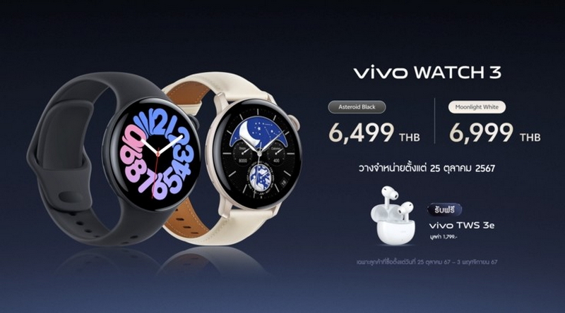 - พิเศษยิ่งขึ้น! สำหรับผู้ที่สั่งซื้อภายในวันที่ 24 ตุลาคม – 3 พฤจิกายน 2567 ณ vivo Brandshop ทั่วประเทศและตัวแทนจำหน่ายทุกสาขา สามารถรับส่วนลด 1,000 บาทเพื่อแลกซื้อ Watch 3 ในราคาพิเศษ พร้อมรับฟรี หูฟัง TWS 3e (มูลค่า 1,799 บาท)