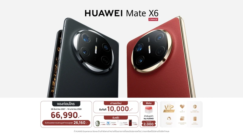 หัวเว่ย คอนซูมเมอร์ บิสสิเนส กรุ๊ป (ประเทศไทย) ประกาศราคาไทย HUAWEI Mate X6 สมาร์ทโฟนนแบบพับได้ระดับท็อป มาพร้อมดีไซน์โฉบเฉี่ยวแต่แข็งแกร่ง สุดยอดของเทคโนโลยีการพับเก็บได้พร้อมการถ่ายภาพที่ขับเคลื่อนด้วย AI นําเสนอคุณสมบัติขั้นสูงเพื่อตอบสนองความต้องการของไลฟ์สไตล์ที่ลงตัว วางจำหน่ายในราคา 66,990 บาท