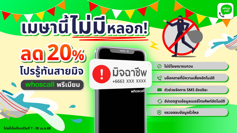 นางสาวมนประภา รัตนกนกพร หัวหน้าฝ่ายการตลาด บริษัทโกโกลุก ประเทศไทย ผู้พัฒนาและให้บริการแอปพลิเคชัน Whoscall กล่าวว่า “ในช่วงเทศกาลสงกรานต์คือช่วงเวลาที่หลายคนใช้สำหรับการเดินทางหรือพักผ่อน แต่มิจฉาชีพมักจะใช้โอกาสในช่วงที่เราไม่ทันตั้งตัว ออกอุบายกลโกงมาในรูปแบบของ SMS หลอกให้กดลิงก์พัสดุปลอม โทรศัพท์แอบอ้างเป็นเจ้าหน้าที่ หรือข้อความหลอกลวงให้โอนเงินด่วน ซึ่งอาจก่อให้เกิดความเสียหายทั้งทางการเงินและข้อมูลส่วนบุคคลได้อย่างรวดเร็ว Whoscall จึงขอถือโอกาสนี้มอบโปรโมชันพิเศษสำหรับผู้ที่สนใจสมัครใช้บริการ Whoscall พรีเมียม ที่จะทำให้การสื่อสารของคุณปลอดภัย สะดวกสบายมากยิ่งขึ้น และปกป้องผู้ใช้งานจากมิจฉาชีพอย่างเต็มประสิทธิภาพ โดยปราศจากโฆษณารบกวน”