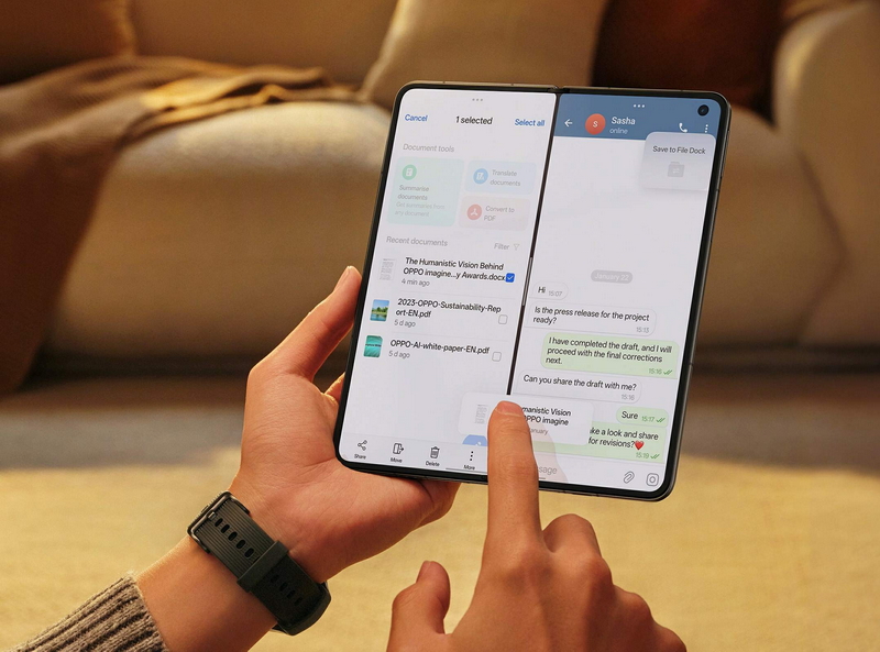 ประสิทธิภาพของหน้าจอพับได้นั้นไม่ได้มีแค่เรื่องเพิ่มประสิทธิภาพการทำงานเท่านั้น แต่ยังช่วยลดความยุ่งยากด้วย และ OPPO Find N5 ก็ทำให้การทำงานของคุณลื่นไหลขึ้นด้วยการรู้ว่าเมื่อไหร่ควรเปิดไฟล์และเอกสารแนบในมุมมองแบบแบ่งหน้าจอ