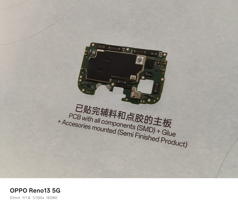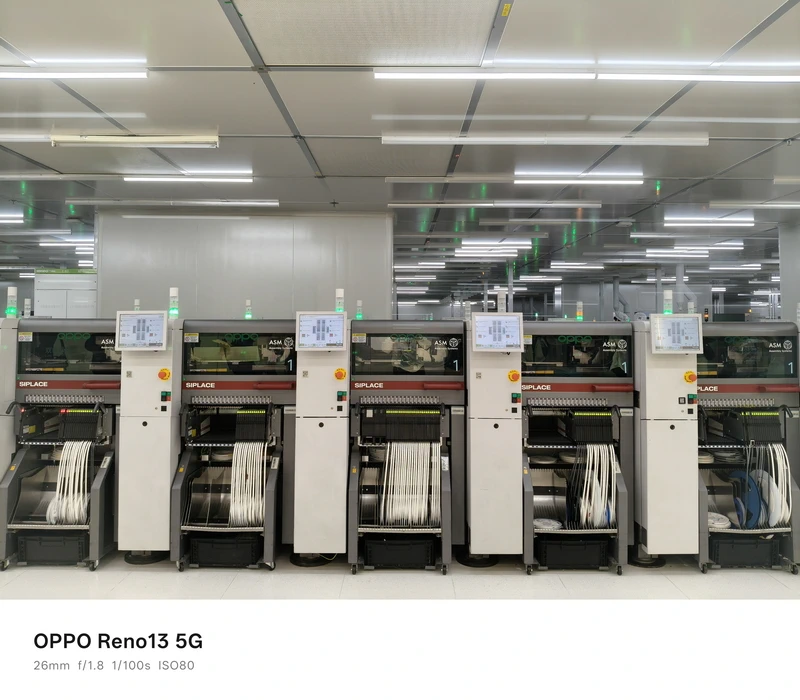 เครื่องติดตั้งชิ้นส่วนความเร็วสูงแบบรางคู่จาก Siemens ประเทศเยอรมนี มีลักษณะเด่นคือ ขนาดเล็ก การออกแบบแบบโมดูล และความแม่นยำ ยำ สูง แต่ละรางด้านหน้าใช้ติดตั้งชิ้นส่วนขนาดเล็ก เช่น ตัวต้านทาน ตัวเก็บประจุ และตัวเหนี่ยวนำ นำ ปัจจุบันชิ้นส่วนที่เล็กที่สุดในเมนบอร์ดของ OPPO มีขนาด 0.4 มม. × 0.2 มม. ขนาดของมันเทียบเท่า 1 ใน 100 ของเหรียญ 1 เจี่ยว (หนึ่งในสิบของหยวน) การติดตั้งด้วยระยะห่างที่แคบยังเป็นตัวแทนของระดับแนวหน้าของอุตสาหกรรม ด้านหลังของรางใช้ติดตั้งชิ้นส่วนขนาดใหญ่ เช่น CPU และชิปหน่วยความจำ