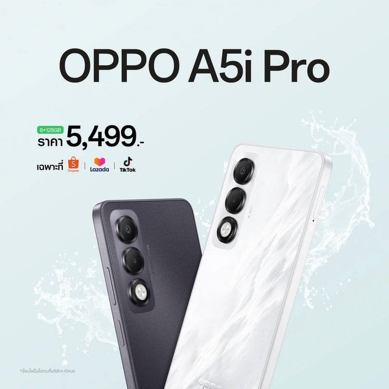 ออปโป้วางจำหน่ายสมาร์ตโฟน OPPO A5 Series พร้อมกัน 2 รุ่น อย่าง OPPO A5x และ OPPO A5i Pro พร้อมเป็นคู่หูความทนทาน สวย ครบ จบทุกดาเมจ OPPO A5x (4+128GB) วางจำหน่ายในราคา 3,999 บาท และ OPPO A5i Pro (8+128GB) วางจำหน่ายในราคาเพียง 5,499 บาท!