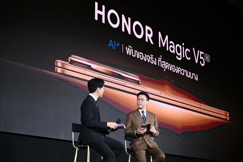 นายพลภัทร์ สายบัวทอง ประธานเจ้าหน้าที่ฝ่ายปฏิบัติการ บริษัท ออเนอร์ ประเทศไทย กล่าว เสริมว่า “วันนี้ผมภูมิใจที่จะประกาศว่า เราทำสำเร็จแล้วกับการเปิดตัว HONOR Magic V5 อุปกรณ์ที่ไม่ใช่เพียง สมาร์ตโฟนจอพับ แต่คือนิยามใหม่ของอุตสาหกรรม ด้วยการเป็นสมาร์ตโฟนจอพับที่ทั้งบางและเบาที่สุด ซึ่งเกิดจากการผสานเทคโนโลยีหลัก 3 ประการเข้าด้วยกันอย่างลงตัว ได้แก่ เทคโนโลยีแบตเตอรี่ขั้นสูง ที่พัฒนาสถาปัตยกรรมใหม่ให้เล็กลงแต่ยังคงทรงพลัง การผลิตที่ขับเคลื่อนด้วย AI ช่วยเพิ่มความแม่นยำตั้งแต่การเลือกวัสดุจนถึงการประกอบและควบคุมคุณภาพ ทำให้แข็งแกร่งและเชื่อถือได้ วัสดุใหม่เพื่ออนาคต ที่ทั้งแข็งแรง ทนทานต่อการพับ และมีน้ำหนักเบา ทำให้พกพาสะดวกยิ่งกว่าเดิม”
