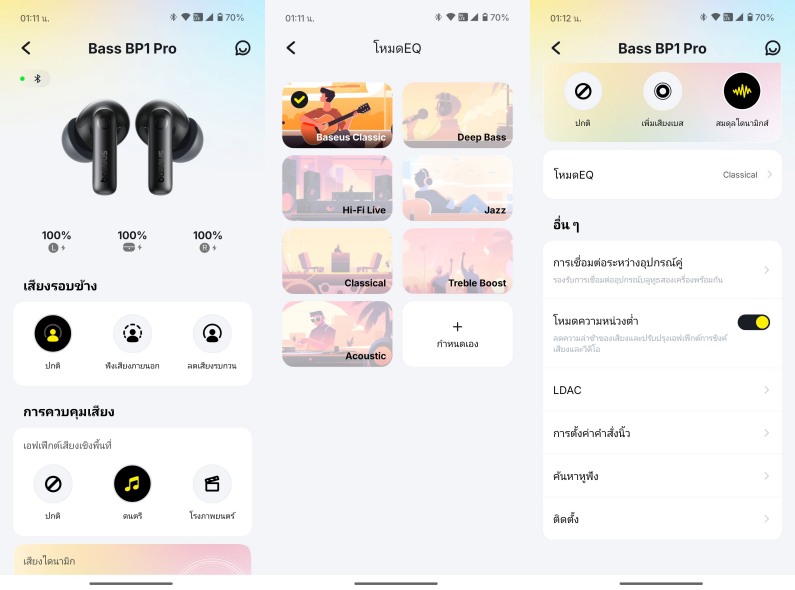 Baseus Bass BP1 Pro เป็นหูฟังที่ใส่สบาย โดยเราจะใช้งานคู่กับแอปพลิเคชัน Baseus ซึ่งมีทั้งบน iOS และ Android มาพร้อม Dynamic Driver ขนาด 10 มม. และรองรับ Hi-Res Audio และ LDAC และระบบตัดเสียงรบกวนสูงสุดถึง -50dB พร้อมไมโครโฟน 6 ตัว ที่มาพร้อม AI ช่วยในการลดเสียงรบกวนในการสนทนาผ่านหูฟัง ช่วยให้การสนทนามีความคมชัด จากการทดสอบเสียงสนทนามีความคมชัดทั้งจากฝั่งเรา และฝั่งตรงข้ามเลยครับ โดยจะแบ่งออกเป็น ปกติ, ฟังเสียงภายนอก และลดเสียงรบกวน (จากการทดสอบเหมือนแอปมีความเพี้ยนๆ ตรงนี้นิดหน่อยนะครับ มีการสลับคำสั่ง)