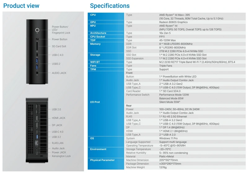 ตัวเครื่องมาพร้อมหน่วยความจำที่รองรับ RAM แบบ LPDDR5 ความเร็ว 8000 MHz ได้สูงสุดถึง 128 GB และพื้นที่จัดเก็บข้อมูลที่สามารถขยายได้ด้วยสล็อต M.2 NVMe แบบคู่ รองรับการจัดเก็บสูงสุดถึง 8 TB — ซึ่งถือเป็นคุณสมบัติระดับสูงที่หาได้ยากในพีซีขนาดเล็ก จึงเหมาะสำหรับผู้ใช้งานที่ต้องการทั้งความยืดหยุ่นและการรองรับในระยะยาว