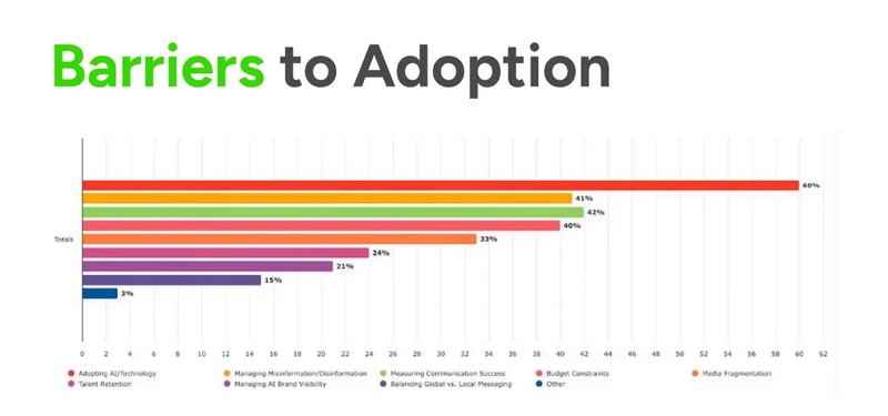 - ความท้าทายสำคัญที่ต้องเผชิญ:มองบวกแต่ยังไม่มั่นใจ ต้องการ Framework การใช้ AI ที่ชัดเจน แม้จะเปิดกว้างรับ AI แต่เมื่อถามถึงความท้าทายที่น่ากังวลที่สุดที่คาดว่าจะต้องเผชิญในอีก 2 ปีข้างหน้า นักประชาสัมพันธ์ส่วนใหญ่กว่า 60% มีความเห็นตรงกันว่า การนำ AI และเทคโนโลยีใหม่มาใช้ท้าทายมากที่สุด รองลงมา 42% คือการวัดผลความสำเร็จของการสื่อสาร ในบริบทใหม่ที่ข้อมูลถูกประมวลผลผ่านระบบ AI มากขึ้น และอีก 41% มองว่าการรับมือกับข้อมูลเท็จและข่าวปลอม ยังเป็นปัญหาเร่งด่วนที่ต้องจัดการ ซึ่งสะท้อนว่า แม้นักประชาสัมพันธ์ส่วนใหญ่จะมีทัศนคติที่ดีต่อ AI แต่การใช้งานอย่างมีประสิทธิภาพยังต้องพึ่งพา “กรอบการทำงานที่ชัดเจน” ทั้งในด้านเครื่องมือ นโยบายและมาตรฐานจริยธรรม