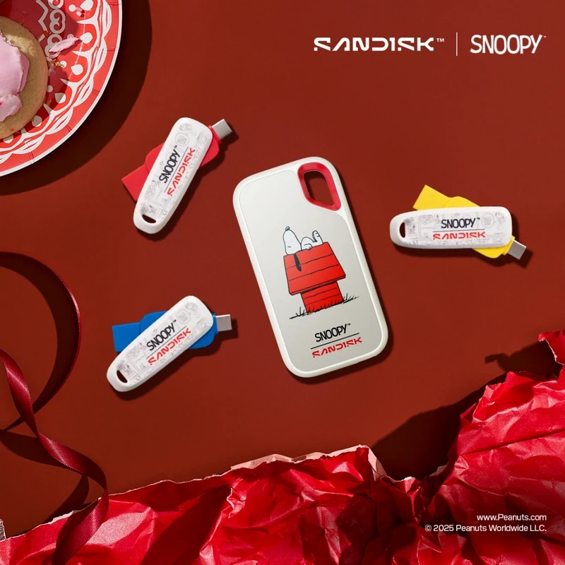 - SANDISK® Snoopy™ Phone Drive – Limited Edition – มีให้เลือก 3 สีสุดพิเศษ ได้แก่ เหลือง (64GB), แดง (128GB) และ น้ำเงิน (256GB) มาพร้อมพอร์ต USB-A และ USB-C ใช้งานสะดวกกับหลากหลายอุปกรณ์ พร้อมแอป SANDISK Memory Zone ที่ช่วยให้การจัดการ สำรอง และแชร์ความทรงจำในช่วงวันหยุดเป็นเรื่องง่ายและสนุกยิ่งขึ้น