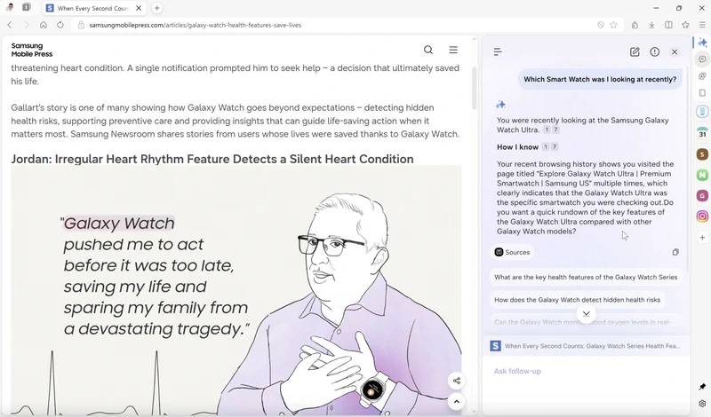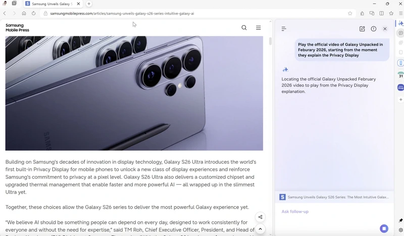• รับรู้บริบทข้ามแท็บ: ผู้ใช้ไม่จำเป็นต้องคลิกเปิดดูแท็บต่างๆ ทีละแท็บเพื่อเปรียบเทียบข้อมูลอีกต่อไป Samsung Browser สามารถสรุปและเปรียบเทียบเนื้อหาจากหลายๆ แท็บได้พร้อมกันในคราวเดียว ทำให้การเข้าถึงข้อมูลเชิงลึกจากแหล่งข้อมูลที่แตกต่างกันในหน้าจอเดียวเป็นเรื่องง่าย