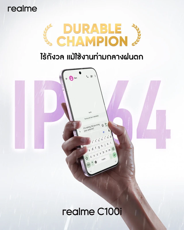 สายลุยไม่ต้องห่วงเรื่องมือถือพัง! เพราะ realme C100i มาพร้อม เทคโนโลยี ArmorShell Protection มอบการปกป้อง 5 จุดหลัก ด้วยโครงสร้างกรอบยกขอบป้องกันมุม กระจกเสริมความแข็งแรง โฟมดูดซับแรงกระแทก ทนตกด้านหน้าจากความสูง 2 เมตรบนพื้นหินอ่อน ผ่านมาตรฐานทหาร MIL-STD 810H จากการทดสอบมากกว่า 130 รายการ ครอบคลุมกว่า 320 ขั้นตอน ซึ่งมีมาตรฐานสูงกว่าค่าเฉลี่ยของอุตสาหกรรมมือถือทั่วไปถึง 30% เสริมด้วยมาตรฐานกันน้ำกันฝุ่นระดับ IP64 และ Wet Hand Touch 2.0 ตอบสนองเร็วขึ้นกว่า 25% แม้ใช้งานขณะมือเปียก