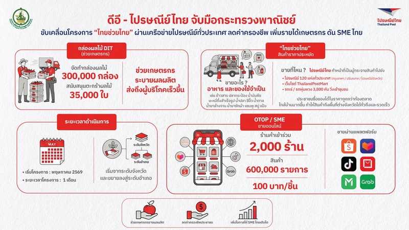 บริษัท ไปรษณีย์ไทย จำกัด ขานรับนโยบายกระทรวงดิจิทัลเพื่อเศรษฐกิจและสังคม (ดีอี) เดินหน้าโครงการ “ไทยช่วยไทย” ผนึกกำลังกรมการค้าภายใน กระทรวงพาณิชย์ ใช้เครือข่ายไปรษณีย์ทั่วประเทศเป็นโครงข่ายหลักในการกระจายสินค้าราคาประหยัดสู่ประชาชน พร้อมยกระดับบทบาทองค์กรสู่โครงสร้างพื้นฐานด้านโลจิสติกส์เพื่อสังคม มุ่งลดค่าครองชีพ สร้างรายได้ และขับเคลื่อนเศรษฐกิจฐานรากอย่างเป็นรูปธรรม