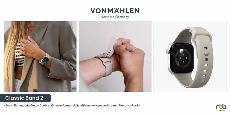 - VONMÄHLEN Classic Band 2สายสำหรับ Apple Watch ดีไซน์คลาสสิกที่ผสานความเรียบหรูและฟังก์ชันการใช้งานอย่างลงตัว ผลิตจากซิลิโคนรีไซเคิลคุณภาพสูง ผิวเรียบนุ่ม ยืดหยุ่น และไม่ระคายเคืองผิว มาพร้อมช่องระบายอากาศด้านใน ช่วยให้อากาศไหลเวียนได้ดียิ่งขึ้น ลดความร้อนและเหงื่อสะสม ทำให้ข้อมือแห้งสบายตลอดทั้งวัน เหมาะสำหรับการใช้งานในชีวิตประจำวันและไลฟ์สไตล์สายแอคทีฟ ตัวล็อกแบบหมุดซ่อนปลายสาย (Pin-and-Tuck) ช่วยให้สวมใส่ได้กระชับและปรับขนาดได้ง่าย รองรับ Apple Watch ขนาด 40/41/42mm และ 44/45/46/49mm มีให้เลือก 3 สี ได้แก่ Black, Navy และ Cream วางจำหน่ายในราคา 890 บาท