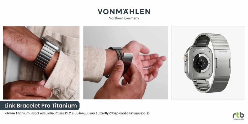 - VONMÄHLEN Link Bracelet Pro Titaniumสายสำหรับ Apple Watch ระดับพรีเมียมที่ผสานความหรูหราและความแข็งแกร่งได้อย่างลงตัว ดีไซน์แบบผิวด้านทั้งชิ้น ให้ลุคที่เรียบหรูดูทันสมัย ผลิตจากไทเทเนียมเกรด 2 พร้อมส่วนผสมของวัสดุรีไซเคิล 25% น้ำหนักเบา สวมใส่สบาย ไม่ระคายเคืองผิว และทนทานต่อการกัดกร่อน ไม่เป็นสนิม ข้อต่อแต่ละชิ้นผ่านการเคลือบ PVD คุณภาพสูง ตัวสายเคลือบแบบ Diamond-Like Carbon (DLC) ทำให้พื้นผิวเรียบเนียน ทนทานต่อการสึกหรอ และช่วยปกป้องรอยขีดข่วนได้อย่างมีประสิทธิภาพ ทำให้สายมีอายุการใช้งานที่ยาวนาน มาพร้อมตัวล็อกแบบบางที่กลมกลืนกับสาย สามารถปรับความยาวสายได้อย่างง่ายดายด้วยชุดอุปกรณ์ที่มีมาให้ รองรับ Apple Watch ขนาด 44/45/46/49mm มีให้เลือก 2 สี ได้แก่ Black และ Natural วางจำหน่ายในราคา 6,990 บาท