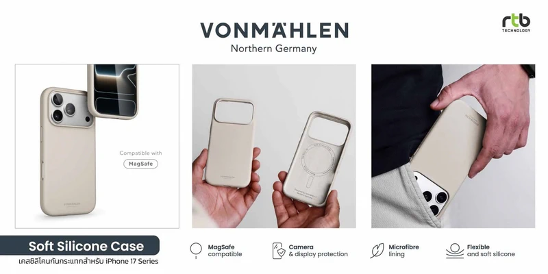 - VONMÄHLEN Soft Silicone Caseเคสซิลิโคนสำหรับ iPhone 17 Series ที่โดดเด่นด้วยดีไซน์บางเฉียบ น้ำหนักเบา และแนบสนิทไปกับตัวเครื่อง มอบทั้งความสวยงามและการปกป้องรอบด้าน ผลิตจากวัสดุรีไซเคิลที่ได้รับการรับรองมาตรฐาน GRS (Global Recycle Standard Certified) สูงสุดถึง 69% เพื่อช่วยลดผลกระทบด้านสิ่งแวดล้อม ด้านนอกผลิตจากซิลิโคนที่ผสานเทคโนโลยี Ever-Soft ให้ผิวสัมผัสที่เนียนนุ่มเป็นพิเศษ ขณะที่ด้านในบุด้วยไมโครไฟเบอร์เนื้อนุ่ม ช่วยป้องกันรอยขีดข่วนและดูดซับแรงกระแทก โครงสร้างแบบปิดด้านล่างช่วยเพิ่มการปกป้องมากยิ่งขึ้น พร้อมช่องพอร์ตที่ออกแบบอย่างแม่นยำเพื่อการใช้งานที่สะดวก ปุ่มกดซิลิโคนตอบสนองไว รองรับการชาร์จแบบแม่เหล็กไร้สาย (MagSafe) พร้อมขอบรอบหน้าจอและเลนส์กล้องยกสูง เพื่อป้องกันแรงกระแทกและรอยขีดข่วน รองรับ iPhone 17, iPhone 17 Air, iPhone 17 Pro และ iPhone 17 Pro Max มีให้เลือกหลายสี ได้แก่ Black, Navy, Light Gray, Cream, Dark Cream และ Dark Red วางจำหน่ายในราคา 990 บาท