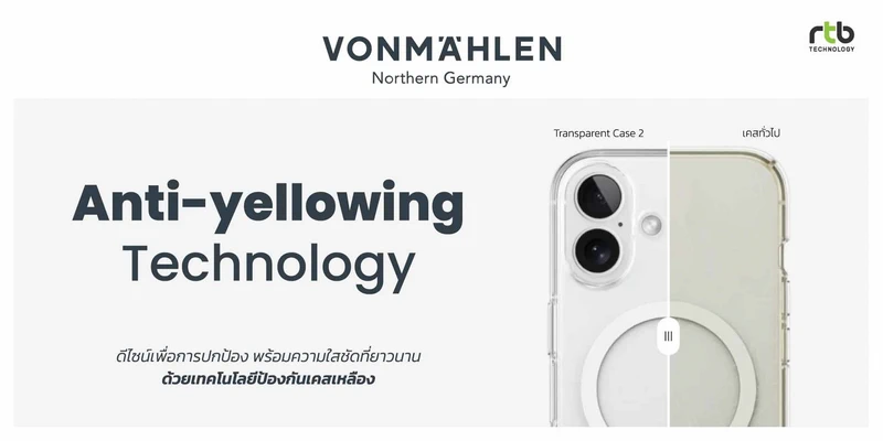 - VONMÄHLEN Transparent Case 2เคสใสกันกระแทกสำหรับ iPhone 17 Series ที่ผสานดีไซน์บางเฉียบเข้ากับการปกป้องอย่างเต็มประสิทธิภาพ พร้อมโชว์ความสวยงามของตัวเครื่องได้อย่างชัดเจน ผลิตจากวัสดุ TPU และ PC ที่ผ่านการรับรองมาตรฐาน GRS (Global Recycle Standard Certified) ช่วยลดผลกระทบด้านสิ่งแวดล้อม พร้อมเคลือบสาร Anti-Yellowing ช่วยป้องกันเคสเหลืองและคงความใสได้ยาวนาน มาพร้อมปุ่มกดเมทัลลิกที่ตอบสนองไว ใช้งานได้อย่างลื่นไหล รองรับการชาร์จแบบแม่เหล็กไร้สาย (MagSafe) ด้วยแม่เหล็กแรงดูดแน่นในตัว ขอบรอบหน้าจอและเลนส์กล้องยกสูง เพิ่มการปกป้องจากแรงกระแทกและรอยขีดข่วน รองรับ iPhone 17, iPhone 17 Air, iPhone 17 Pro และ iPhone 17 Pro Max วางจำหน่ายในราคา 1,190 บาท