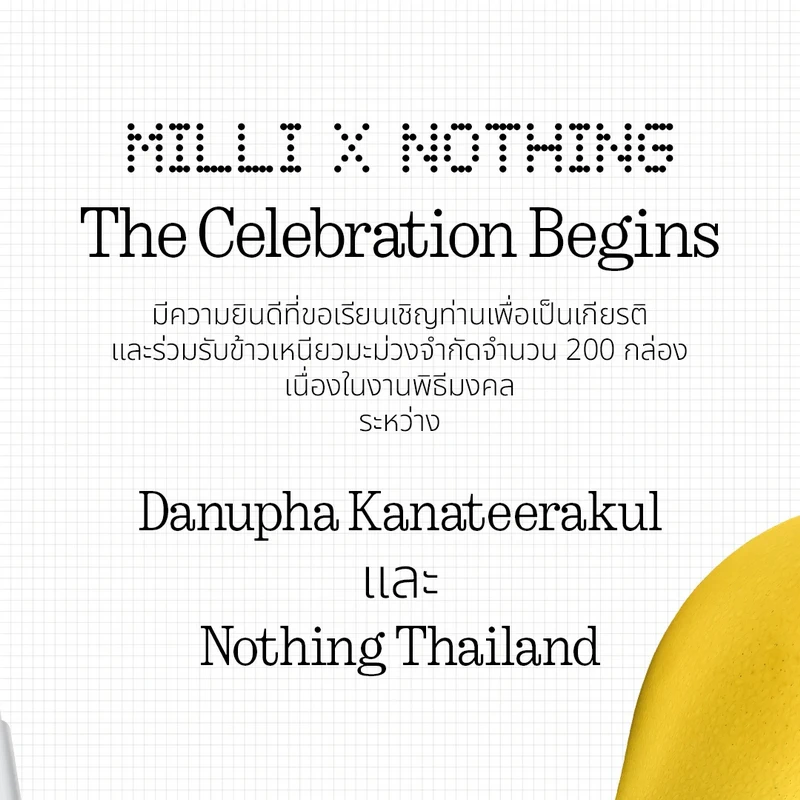 สามารถติดตามจุดเริ่มต้นครั้งใหม่ของ Nothing Thailand และ MILLI ได้ในงานอีเวนต์ “MILLI meets Nothing: The Celebration Begins” วันที่ 25 เมษายน 2569 เวลา 16:00 – 18:00 ณ Siam Center ฝั่งลานน้ำพุ ใจกลางสยาม ซึ่งจะถูกเนรมิตให้เป็นพื้นที่เฉลิมฉลองครั้งใหญ่ เพื่อขอบคุณแฟน ๆ ที่ร่วมเชียร์ทั้ง Nothing และ MILLI ตลอดที่ผ่านมา สำหรับแฟน ๆ ที่อยากเป็นส่วนหนึ่งของโมเมนต์สำคัญครั้งนี้ สามารถ walk-in ร่วมงานได้ โดย 200 คนแรกจะได้รับสิทธิ์พิเศษในการเข้าร่วมกิจกรรมอย่างใกล้ชิด