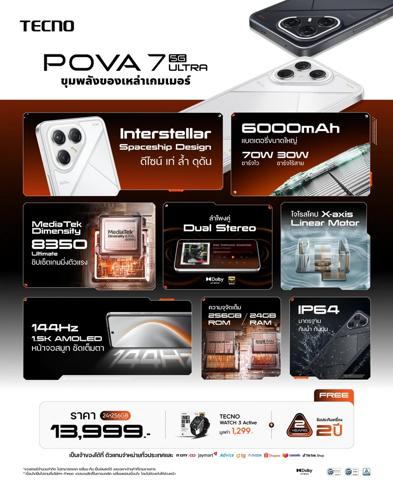 พร้อมให้คุณเป็นเจ้าของแล้ววันนี้ โดย TECNO POVA 7 Ultra 5G มาพร้อมหน่วยความจำขนาดใหญ่จุใจ 24GB (RAM) + 256GB (ROM) ในราคาสุดคุ้มค่าเพียง 13,999 บาทพิเศษสุด! สำหรับช่วงเปิดตัว * รับฟรีทันที! สมาร์ทวอทช์ TECNO Active Watch 3 มูลค่า 1,299 บาท และ อุ่นใจยิ่งขึ้นด้วย การรับประกันตัวเครื่องยาวนานถึง 2 ปี ตั้งแต่วันนี้เป็นต้นไปหรือจนกว่าของแถมจะหมด